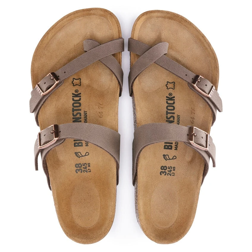 The BIRKENSTOCK Mayari thong sandal is a jaunty model with a toe loop. The impressive combination of design and wearability will see fashion-conscious men and women through the day with elegance and comfort. The upper is made from the skin-friendly, hard-wearing synthetic material Birko-Flor® in a sophisticated nubuck look which boasts a texture and color that could almost be mistaken for real leather.